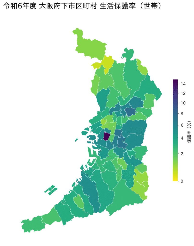 大阪府 生活保護率マップ 令和6年度|市区町村別の実績データを色分けで可視化 データで見る住みやすさ